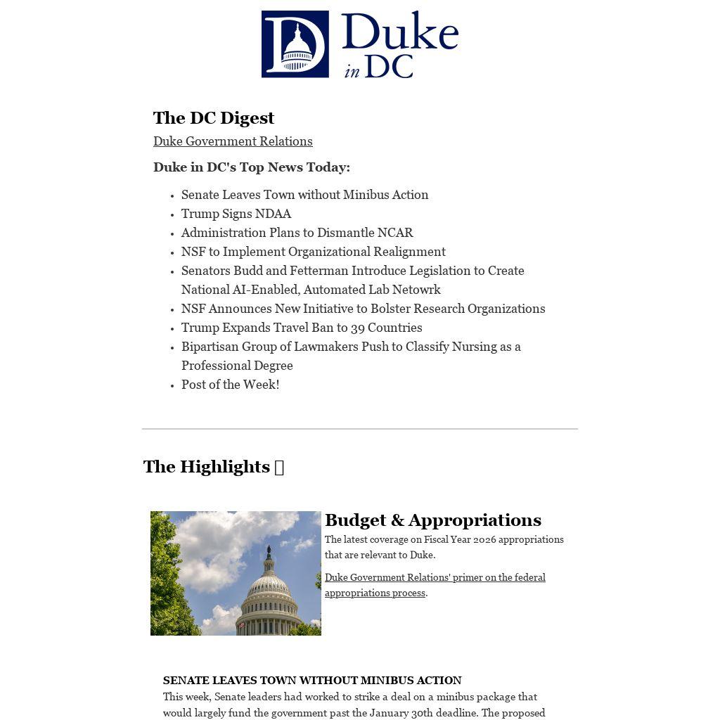 | Budget & Appropriations The latest coverage on Fiscal Year 2026 appropriations that are relevant to Duke.