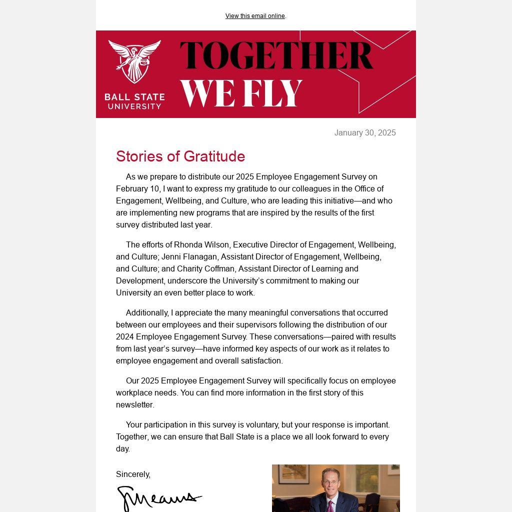 As we prepare to distribute our 2025 Employee Engagement Survey on February 10, I want to express my gratitude to our colleagues in the Office of Engagement, Wellbeing, and Culture, who are leading this initiative—and who are implementing new programs that are inspired by the results of the first survey distributed last year.