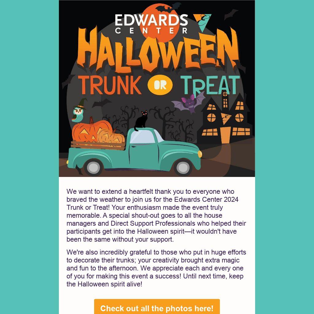 We want to extend a heartfelt thank you to everyone who braved the weather to join us for the Edwards Center 2024 Trunk or Treat! Your enthusiasm made the event truly memorable. A special shout-out goes to all the house managers and Direct Support Professionals who helped their participants get into the Halloween spirit—it wouldn't have been the same without your support.