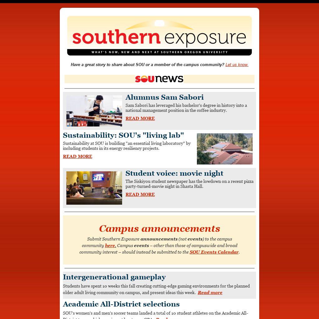Submit Southern Exposure announcements (not events) to the campus community here. Campus events – other than those of campuswide and broad community interest – should instead be submitted to the SOU Events Calendar.