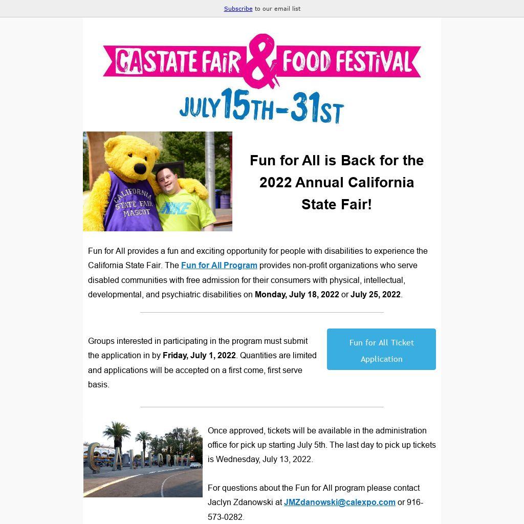 Fun for All provides a fun and exciting opportunity for people with disabilities to experience the California State Fair. The Fun for All Program provides non-profit organizations who serve disabled communities with free admission for their consumers with physical, intellectual, developmental, and psychiatric disabilities on Monday, July 18, 2022 or July 25, 2022.