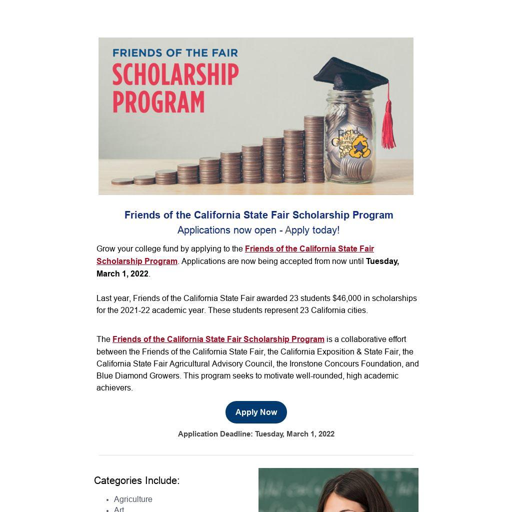 The Friends of the California State Fair Scholarship Program is a collaborative effort between the Friends of the California State Fair, the California Exposition & State Fair, the California State Fair Agricultural Advisory Council, the Ironstone Concours Foundation, and Blue Diamond Growers. This program seeks to motivate well-rounded, high academic achievers.