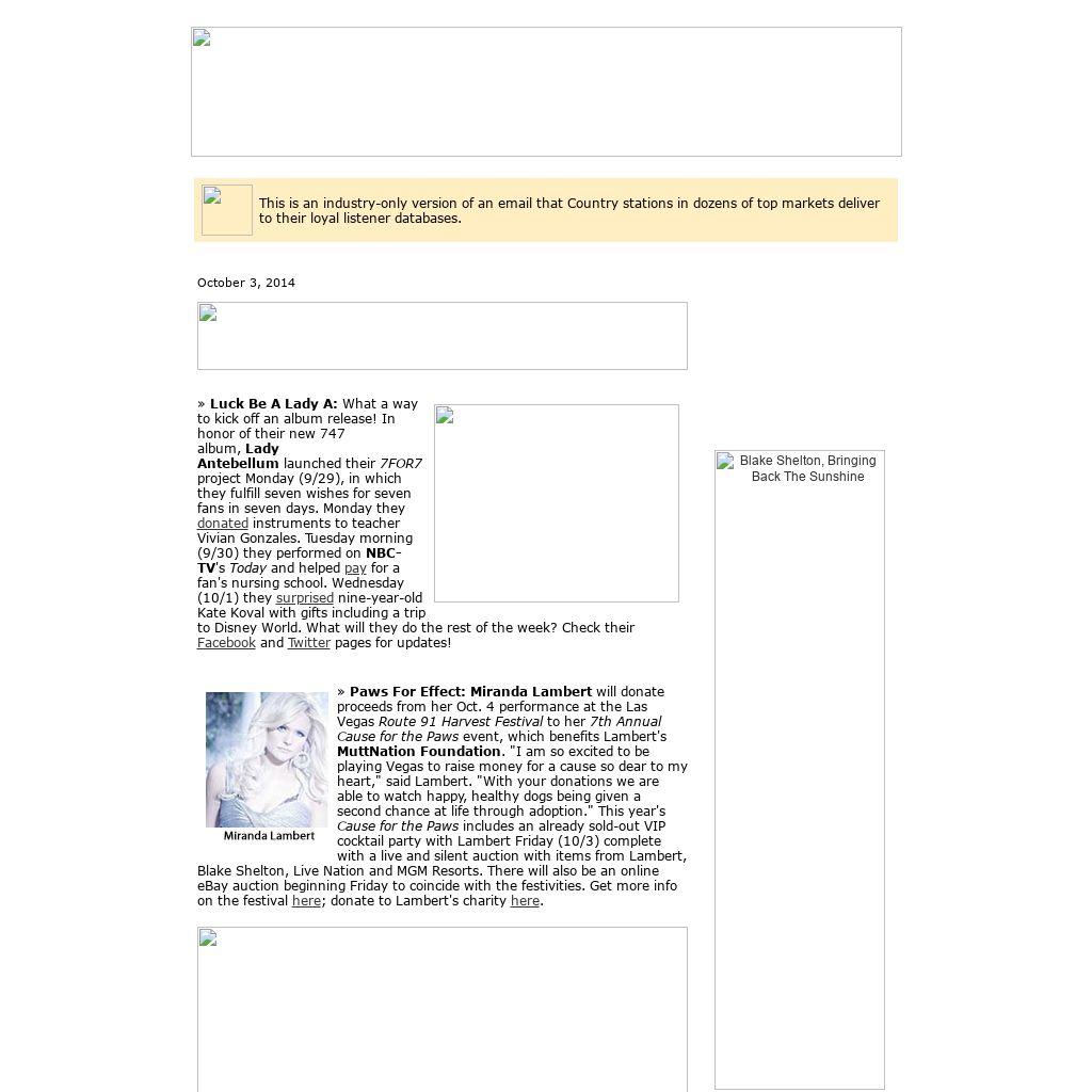 | This is an industry-only version of an email that Country stations in dozens of top markets deliver