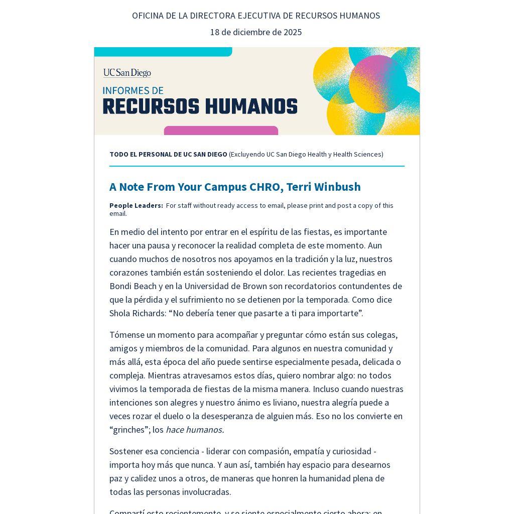 Tómense un momento para acompañar y preguntar cómo están sus colegas, amigos y miembros de la comunidad. Para algunos en nuestra comunidad y más allá, esta época del año puede sentirse especialmente pesada, delicada o compleja. Mientras atravesamos estos días, quiero nombrar algo: no todos vivimos la temporada de fiestas de la misma manera. Incluso cuando nuestras intenciones son alegres y nuestro ánimo es liviano, nuestra alegría puede a veces rozar el duelo o la desesperanza de alguien más. Eso no los convierte en “grinches”; los hace humanos.