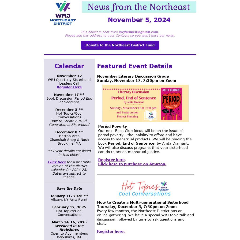Every few months, the Northeast District has an online gathering. We have a special WRJ topic talk and discussion, followed by time to ask questions and chat.