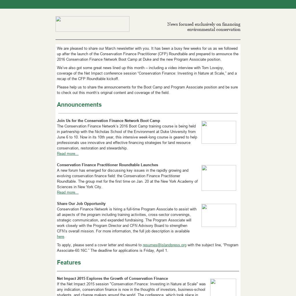| We are pleased to share our March newsletter with you. It has been a busy few weeks for us as we followed up after the launch of the Conservation Finance Practitioner (CFP) Roundtable and prepared to announce the 2016 Conservation Finance Network Boot Camp at Duke and the new Program Associate position. We’ve also got some great news lined up this month – including a video interview with Tom Lovejoy, coverage of the Net Impact conference session “Conservation Finance: Investing in Nature at Scale,” and a recap of the CFP Roundtable kickoff. Please help us to share the announcements for the Boot Camp and Program Associate position and be sure to check out this month’s original content and coverage of the field.