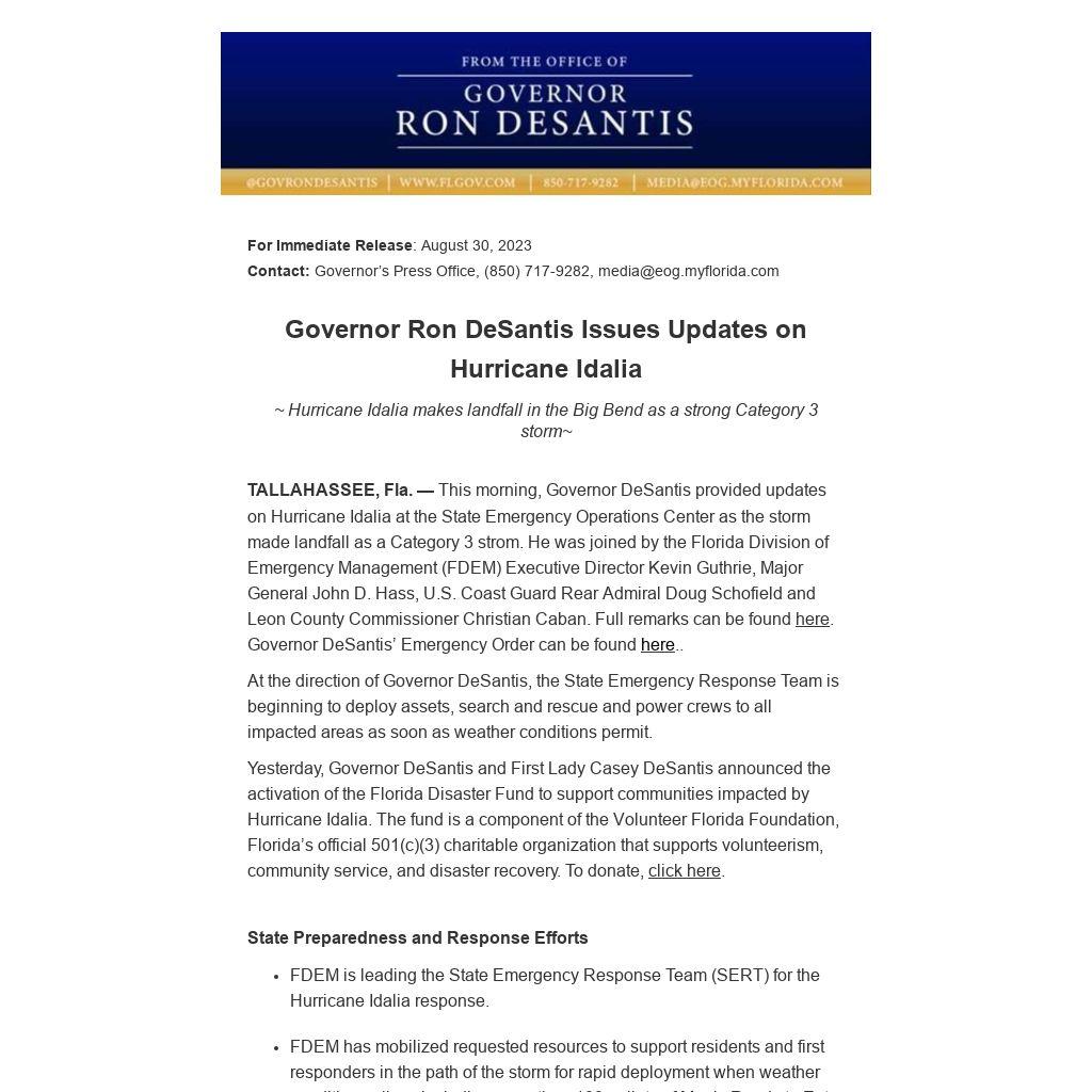 Yesterday, Governor DeSantis and First Lady Casey DeSantis announced the activation of the Florida Disaster Fund to support communities impacted by Hurricane Idalia. The fund is a component of the Volunteer Florida Foundation, Florida’s official 501(c)(3) charitable organization that supports volunteerism, community service, and disaster recovery. To donate, click here.