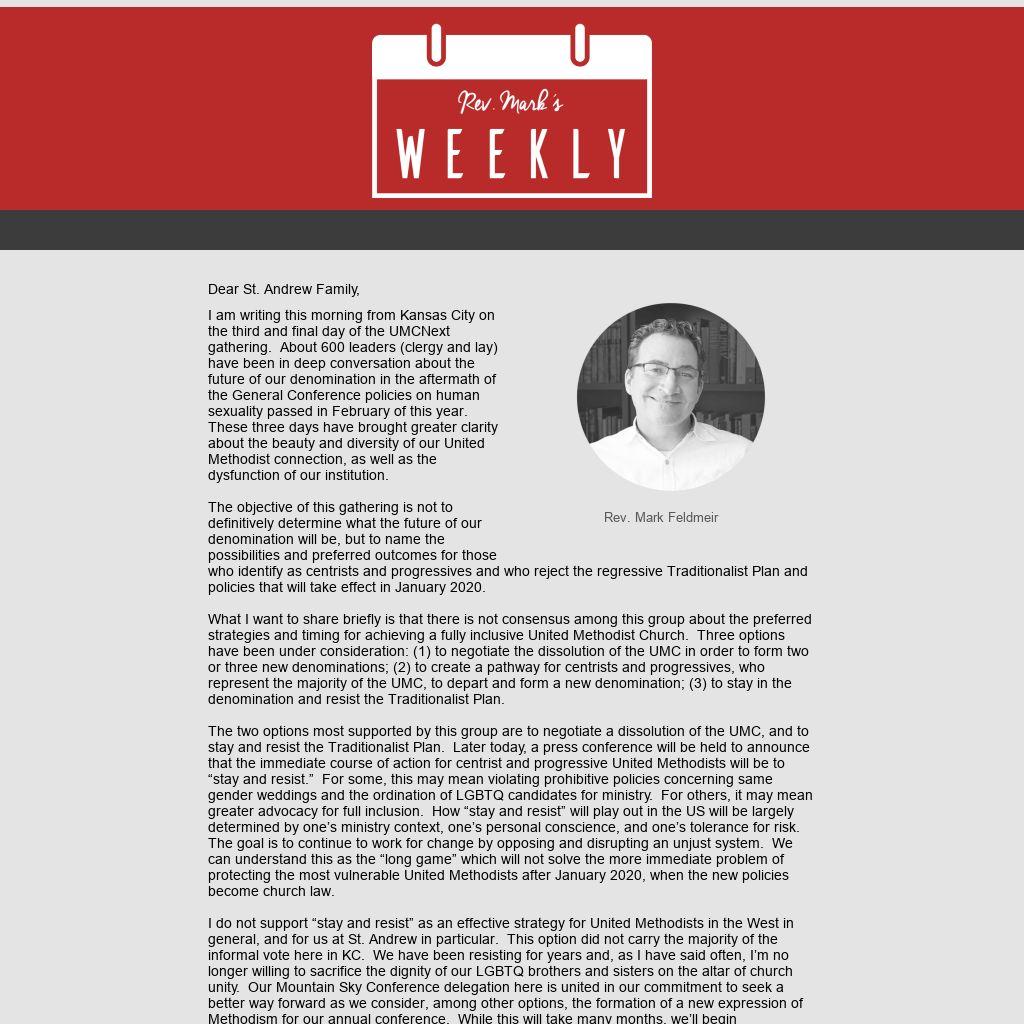 I do not support “stay and resist” as an effective strategy for United Methodists in the West in general, and for us at St. Andrew in particular. This option did not carry the majority of the informal vote here in KC. We have been resisting for years and, as I have said often, I’m no longer willing to sacrifice the dignity of our LGBTQ brothers and sisters on the altar of church unity. Our Mountain Sky Conference delegation here is united in our commitment to seek a better way forward as we consider, among other options, the formation of a new expression of Methodism for our annual conference. While this will take many months, we’ll begin conversations about this exciting possibility at our annual conference gathering in Billings, Montana, in a few weeks.