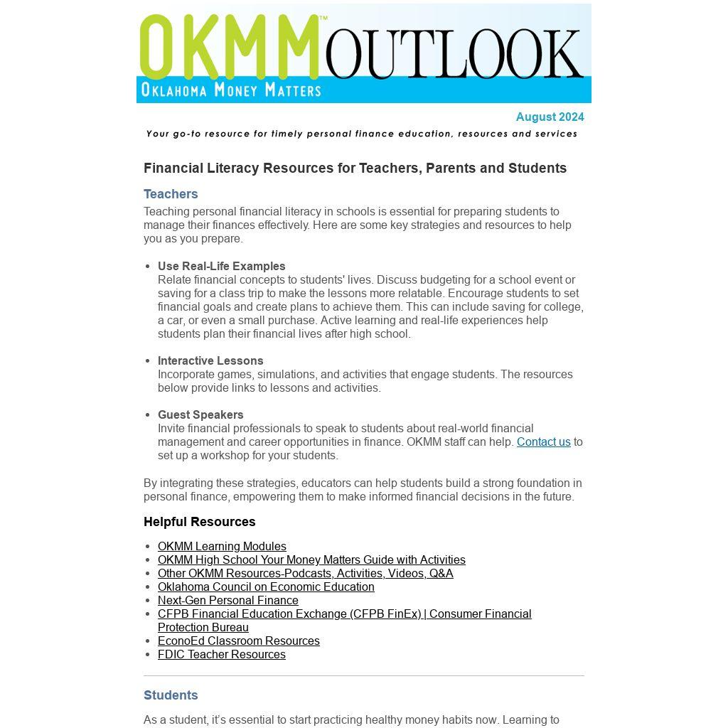 Mark your calendars for upcoming OKMM "Make It Count" webinars on the third Tuesday of every month. Join us on Tuesday, August 20, at noon as we discuss paying for college and the important considerations and research that can make college a possibility for everyone.