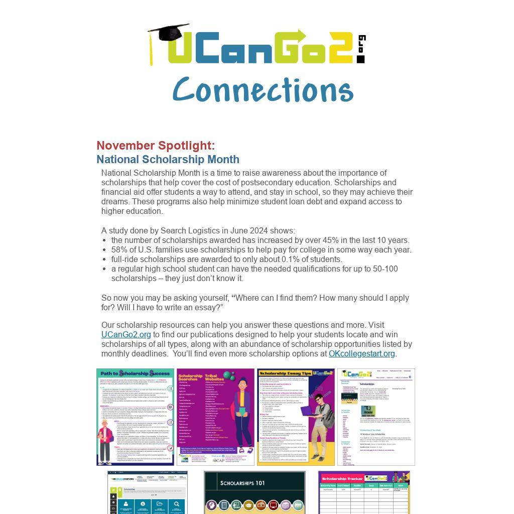 Our scholarship resources can help you answer these questions and more. Visit UCanGo2.org to find our publications designed to help your students locate and win scholarships of all types, along with an abundance of scholarship opportunities listed by monthly deadlines. You’ll find even more scholarship options at OKcollegestart.org.