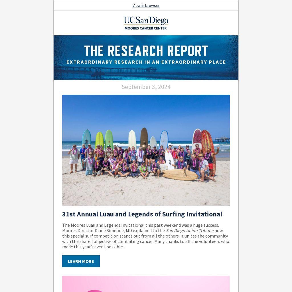 The Moores Luau and Legends Invitational this past weekend was a huge success. Moores Director Diane Simeone, MD explained to the San Diego Union Tribune how this special surf competition stands out from all the others: it unites the community with the shared objective of combating cancer. Many thanks to all the volunteers who made this year’s event possible.