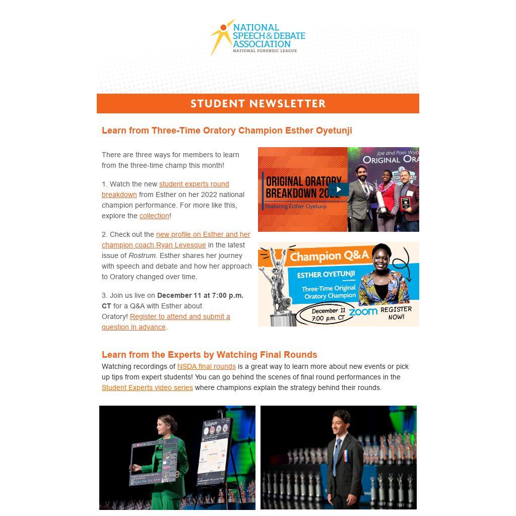 Watching recordings of NSDA final rounds is a great way to learn more about new events or pick up tips from expert students! You can go behind the scenes of final round performances in the Student Experts video series where champions explain the strategy behind their rounds.