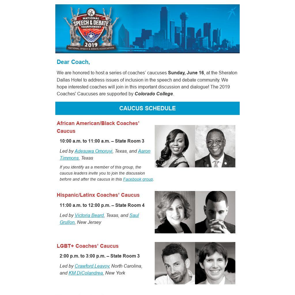 We are honored to host a series of coaches’ caucuses Sunday, June 16, at the Sheraton Dallas Hotel to address issues of inclusion in the speech and debate community. We hope interested coaches will join in this important discussion and dialogue! The 2019 Coaches' Caucuses are supported by Colorado College.