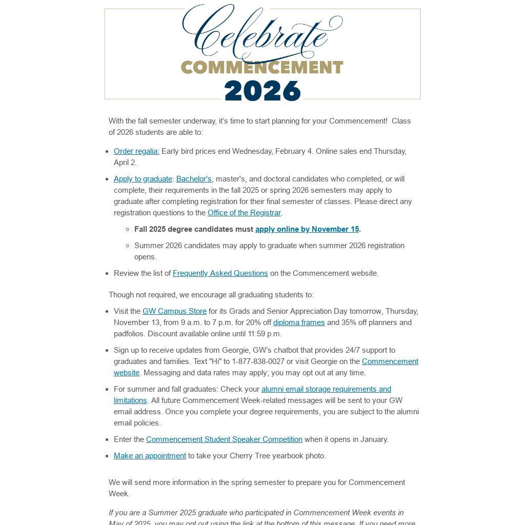If you are a Summer 2025 graduate who participated in Commencement Week events in May of 2025, you may opt out using the link at the bottom of this message. If you need more information, please contact commencement@gwu.edu.