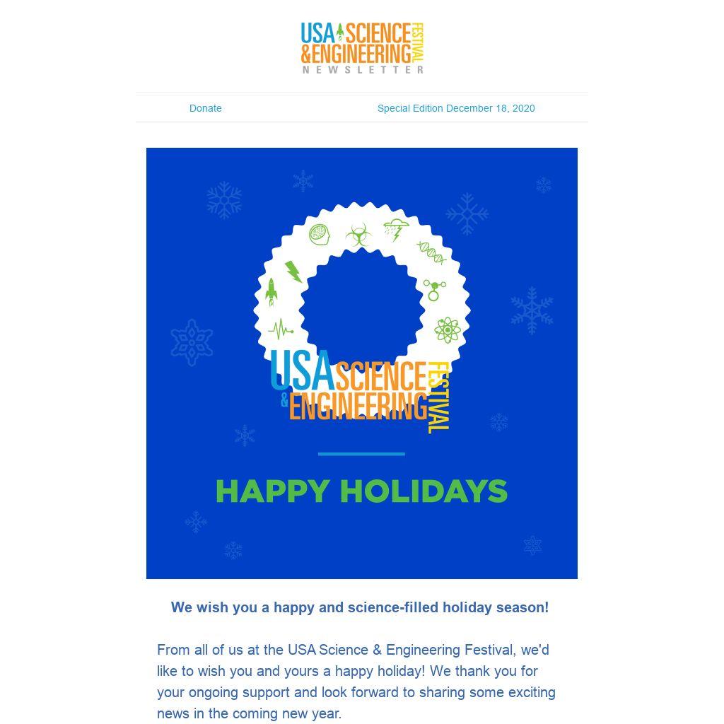From all of us at the USA Science & Engineering Festival, we'd like to wish you and yours a happy holiday! We thank you for your ongoing support and look forward to sharing some exciting news in the coming new year.