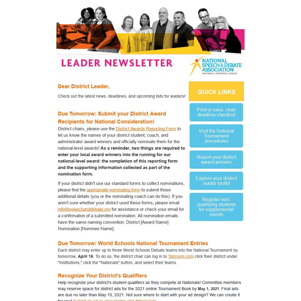 This month's District Leader Town Hall will be held on April 29, 2021, at 5:00 p.m CT. NSDA staff will participate in a discussion with NSDA District leadership on the current state of NSDA school and student membership and conceptualize how the organization might chart a course to fulfill its vision of every student having access to speech and debate activities. In addition, the group will discuss the growing use of Tabroom.com and the best ways for the NSDA to create a sustainable model for the software's use. A link to this meeting will be sent to district leaders on Tuesday, April 27.