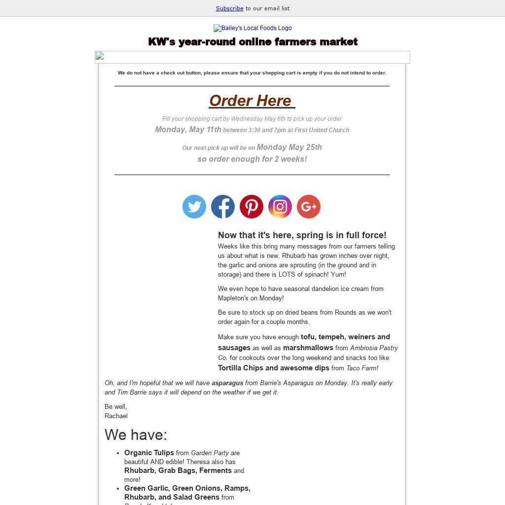 Oh, and I'm hopeful that we will have asparagus from Barrie's Asparagus on Monday. It's really early and Tim Barrie says it will depend on the weather if we get it.
