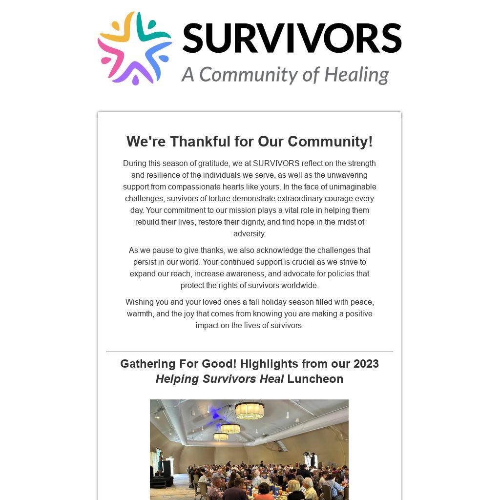During this season of gratitude, we at SURVIVORS reflect on the strength and resilience of the individuals we serve, as well as the unwavering support from compassionate hearts like yours. In the face of unimaginable challenges, survivors of torture demonstrate extraordinary courage every day. Your commitment to our mission plays a vital role in helping them rebuild their lives, restore their dignity, and find hope in the midst of adversity.