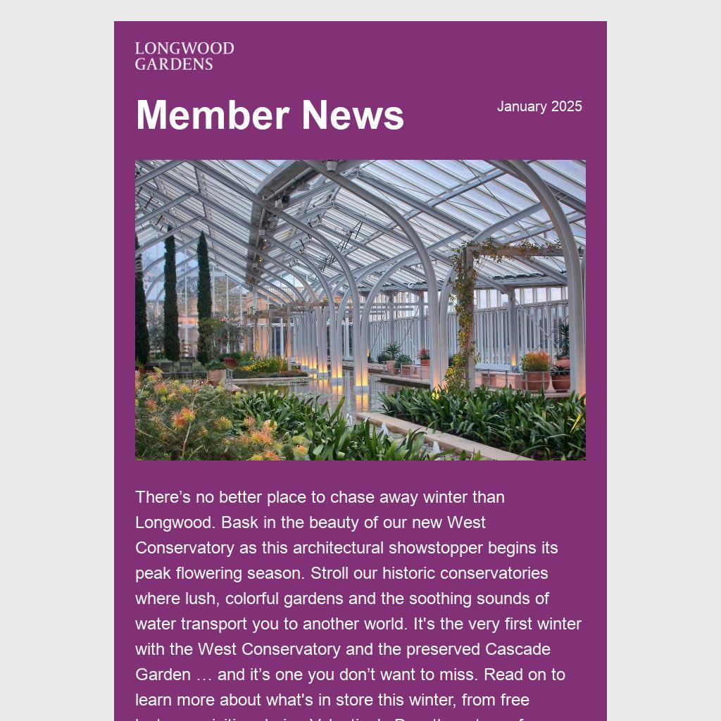 There’s no better place to chase away winter than Longwood. Bask in the beauty of our new West Conservatory as this architectural showstopper begins its peak flowering season. Stroll our historic conservatories where lush, colorful gardens and the soothing sounds of water transport you to another world. It's the very first winter with the West Conservatory and the preserved Cascade Garden … and it’s one you don’t want to miss. Read on to learn more about what's in store this winter, from free lectures, visiting during Valentine's Day, the return of our Science Series, and more!