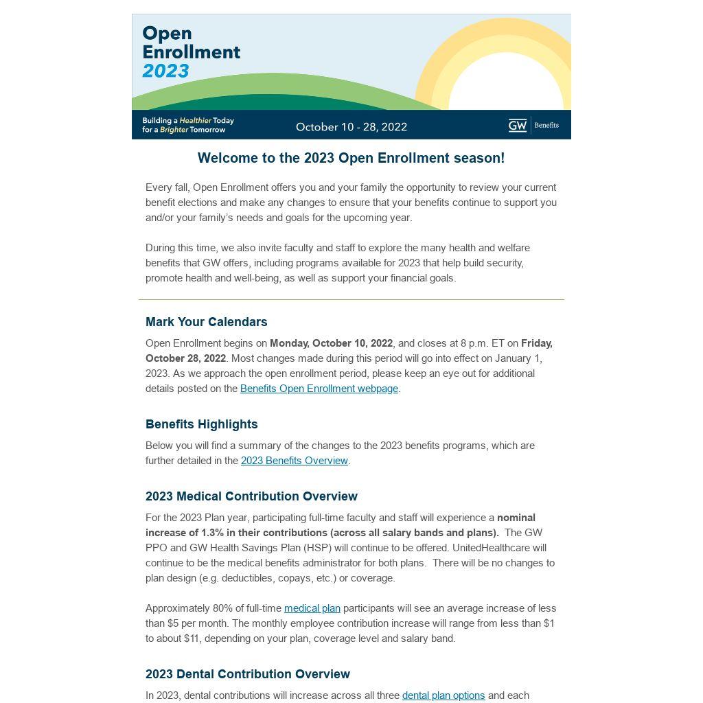 During this time, we also invite faculty and staff to explore the many health and welfare benefits that GW offers, including programs available for 2023 that help build security, promote health and well-being, as well as support your financial goals.