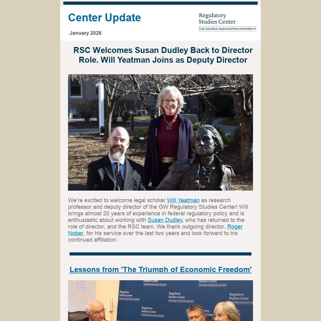 We’re excited to welcome legal scholar Will Yeatman as research professor and deputy director of the GW Regulatory Studies Center! Will brings almost 20 years of experience in federal regulatory policy and is enthusiastic about working with Susan Dudley, who has returned to the role of director, and the RSC team. We thank outgoing director, Roger Nober, for his service over the last two years and look forward to his continued affiliation.