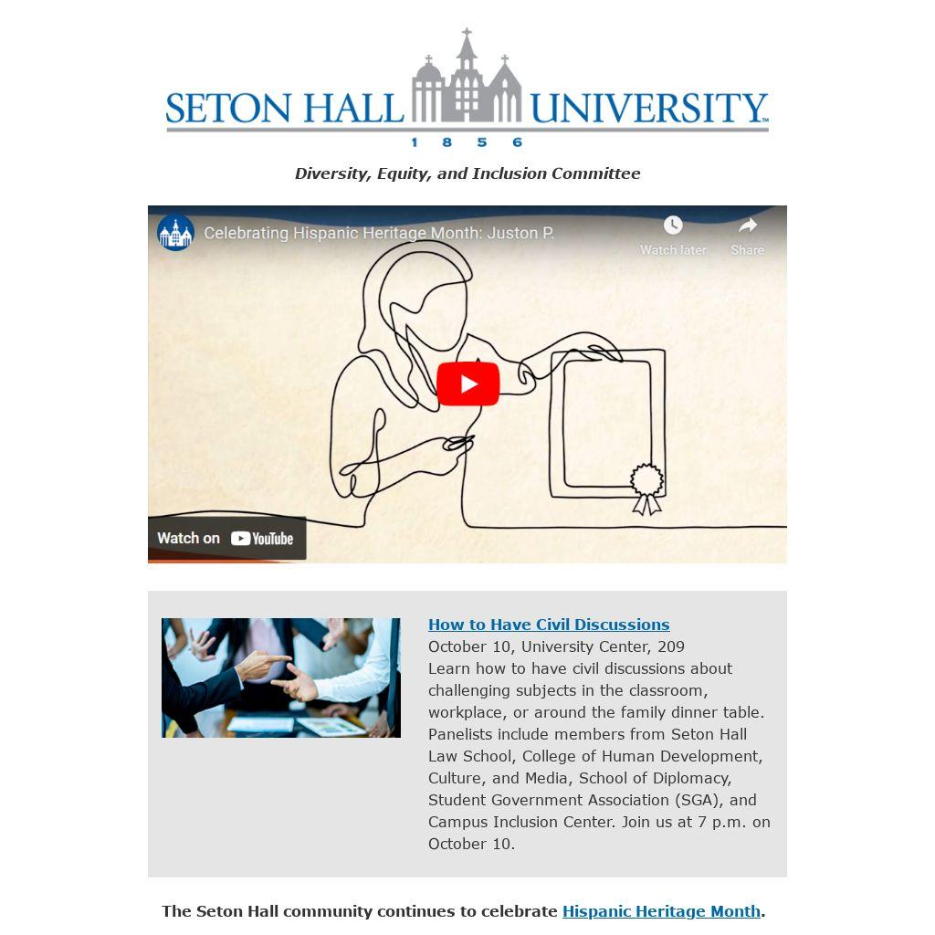 Learn how to have civil discussions about challenging subjects in the classroom, workplace, or around the family dinner table. Panelists include members from Seton Hall Law School, College of Human Development, Culture, and Media, School of Diplomacy, Student Government Association (SGA), and Campus Inclusion Center. Join us at 7 p.m. on October 10.