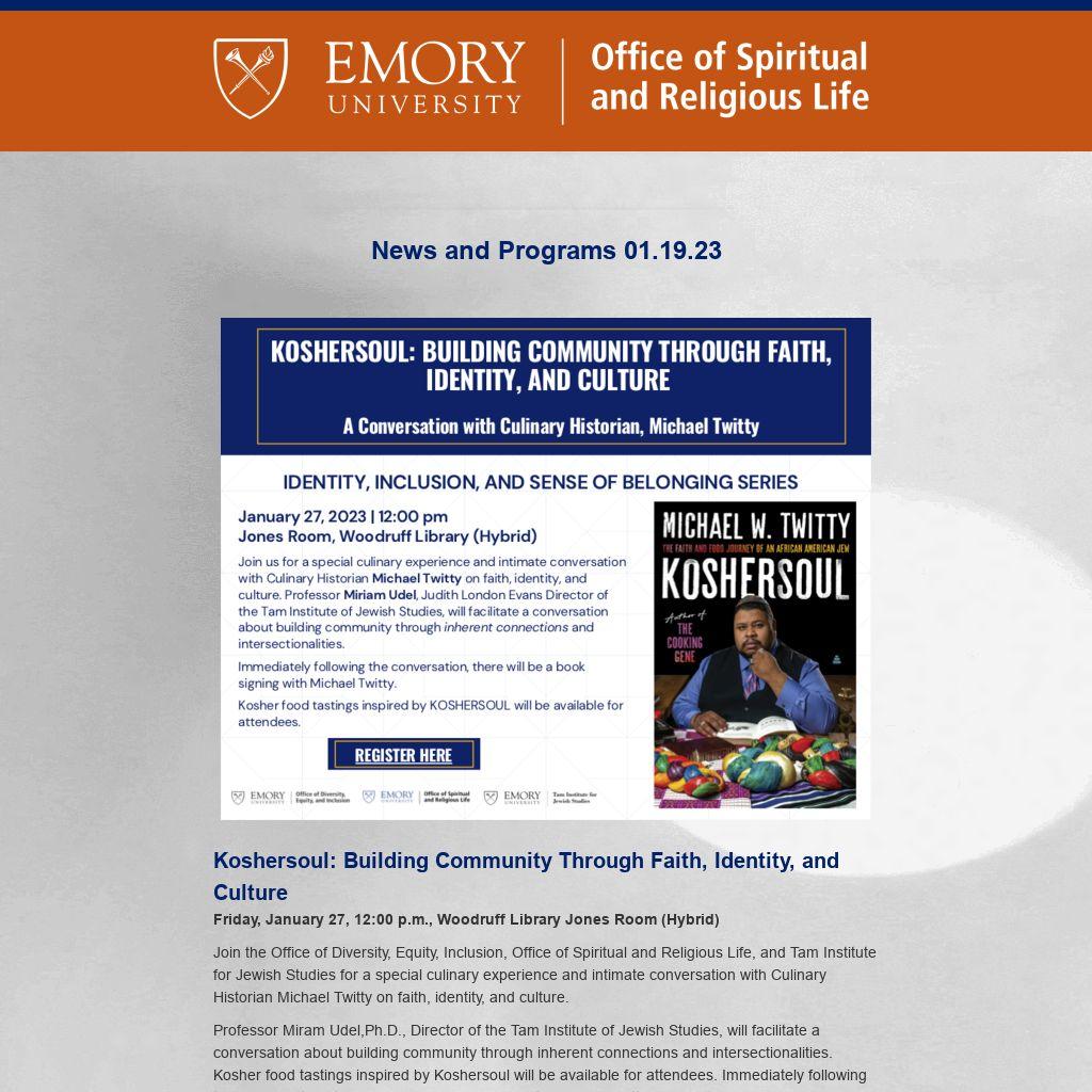 Emory OSRL ENews is published weekly during the term by the Emory University Office of Spiritual and Religious Life publicizing Atlanta-campus spiritual life programs. It is not a comprehensive listing. For Oxford College spiritual life, please click here. To submit information or to update your preferences, please contact religiouslife@emory.edu.