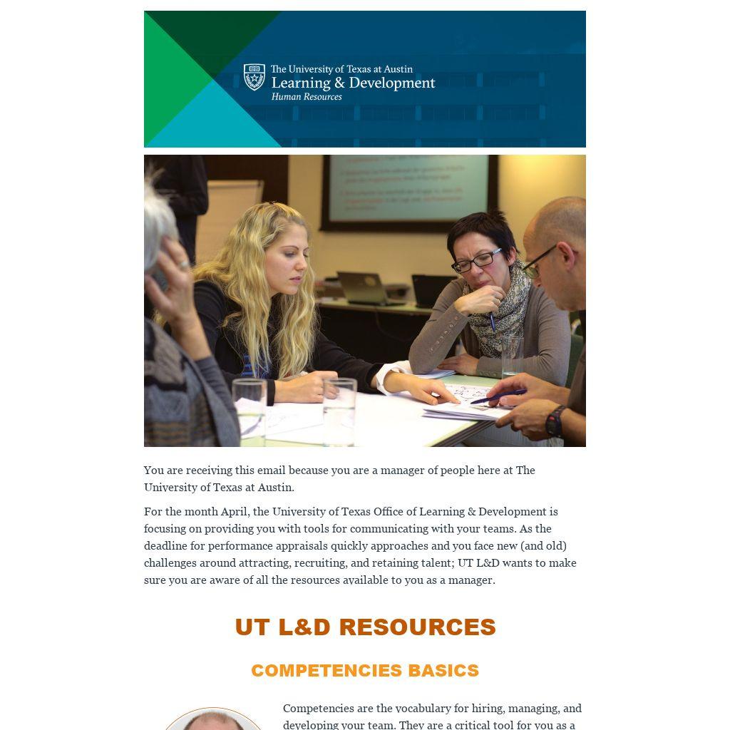 For the month April, the University of Texas Office of Learning & Development is focusing on providing you with tools for communicating with your teams. As the deadline for performance appraisals quickly approaches and you face new (and old) challenges around attracting, recruiting, and retaining talent; UT L&D wants to make sure you are aware of all the resources available to you as a manager.