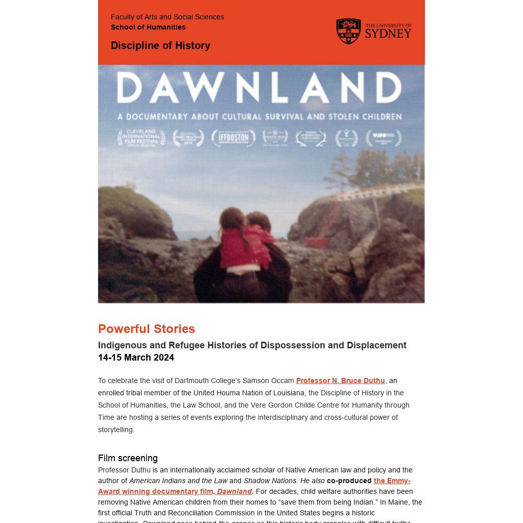To celebrate the visit of Dartmouth College’s Samson Occam Professor N. Bruce Duthu, an enrolled tribal member of the United Houma Nation of Louisiana, the Discipline of History in the School of Humanities, the Law School, and the Vere Gordon Childe Centre for Humanity through Time are hosting a series of events exploring the interdisciplinary and cross-cultural power of storytelling.