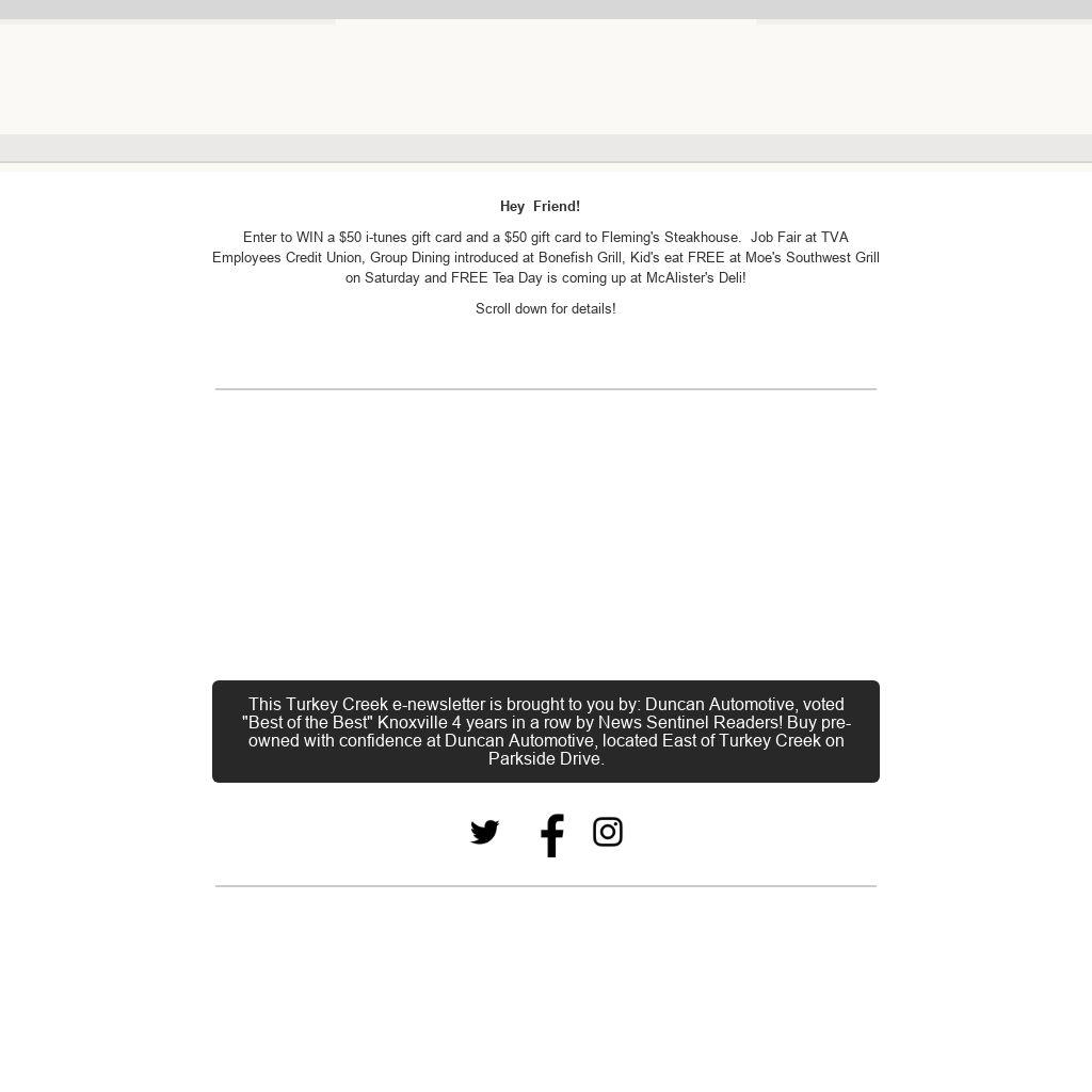 Enter to WIN a $50 i-tunes gift card and a $50 gift card to Fleming's Steakhouse. Job Fair at TVA Employees Credit Union, Group Dining introduced at Bonefish Grill, Kid's eat FREE at Moe's Southwest Grill on Saturday and FREE Tea Day is coming up at McAlister's Deli!