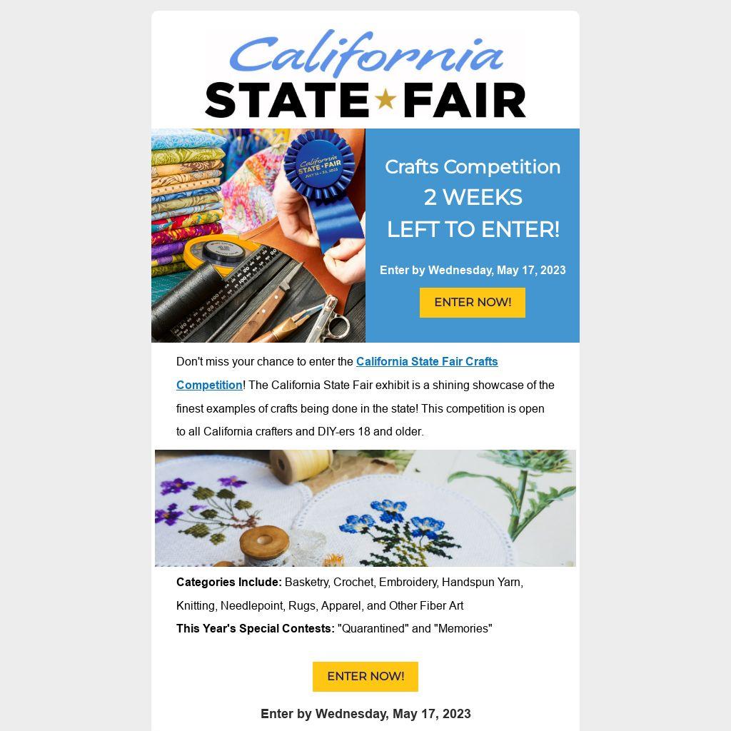 Don't miss your chance to enter the California State Fair Crafts Competition! The California State Fair exhibit is a shining showcase of the finest examples of crafts being done in the state! This competition is open to all California crafters and DIY-ers 18 and older.