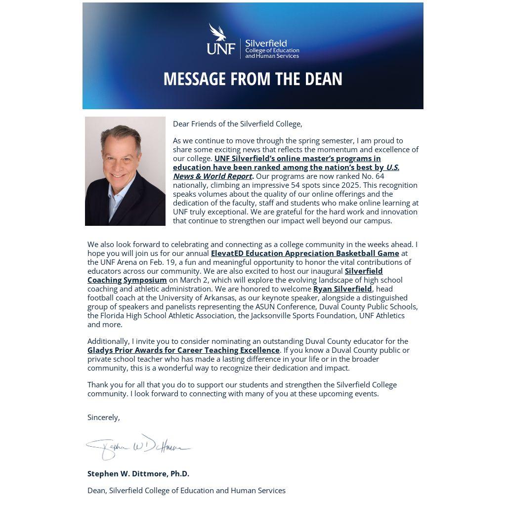As we continue to move through the spring semester, I am proud to share some exciting news that reflects the momentum and excellence of our college. UNF Silverfield’s online master’s programs in education have been ranked among the nation’s best by U.S. News & World Report. Our programs are now ranked No. 64 nationally, climbing an impressive 54 spots since 2025. This recognition speaks volumes about the quality of our online offerings and the dedication of the faculty, staff and students who make online learning at UNF truly exceptional. We are grateful for the hard work and innovation that continue to strengthen our impact well beyond our campus.