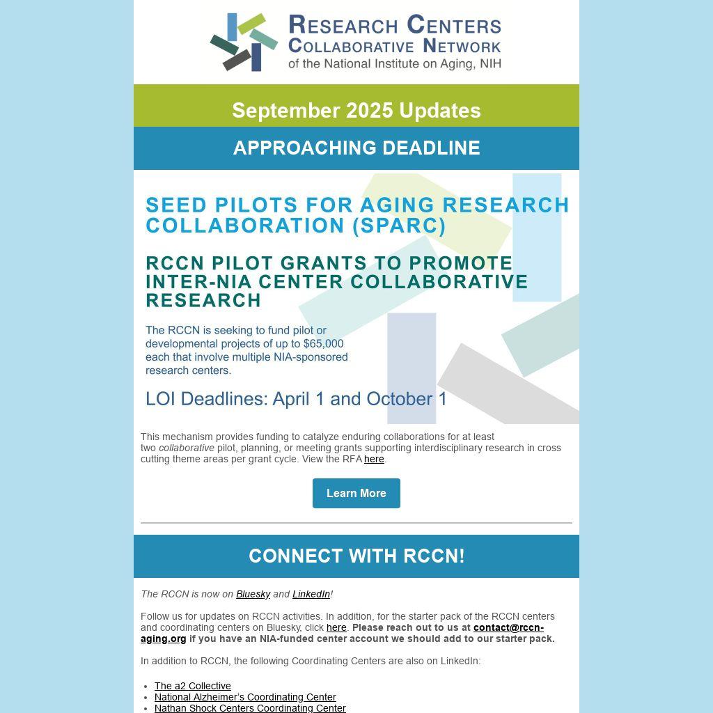Follow us for updates on RCCN activities. In addition, for the starter pack of the RCCN centers and coordinating centers on Bluesky, click here. Please reach out to us at contact@rccn-aging.org if you have an NIA-funded center account we should add to our starter pack.