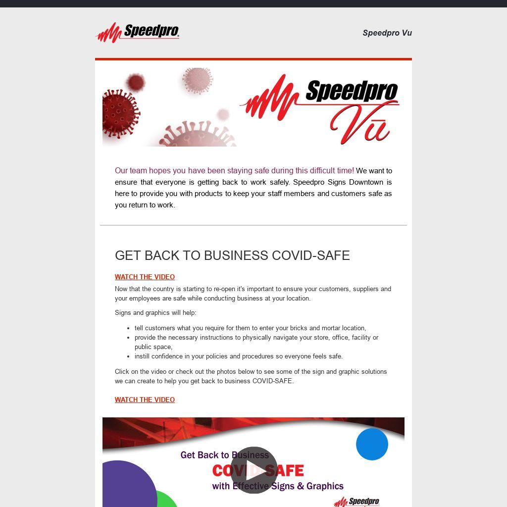 Most of our staff are returning to our Studio to create and produce your signs and graphics quickly and efficiently. We are pleased to meet with you by appointment only, or remotely. Ask about our Speedpro Covid19 “Safe Zone Certified” standards, which we have implemented with internal controls and compliancy protocols to ensure you and our staff are safe in our Studio, and to ensure your signage is fully sanitized prior to contactless pick-up or delivery.
