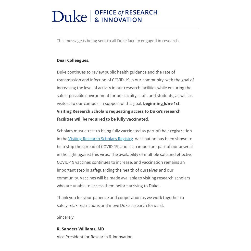 Duke continues to review public health guidance and the rate of transmission and infection of COVID-19 in our community, with the goal of increasing the level of activity in our research facilities while ensuring the safest possible environment for our faculty, staff, and students, as well as visitors to our campus. In support of this goal, beginning June 1st, Visiting Research Scholars requesting access to Duke’s research facilities will be required to be fully vaccinated.