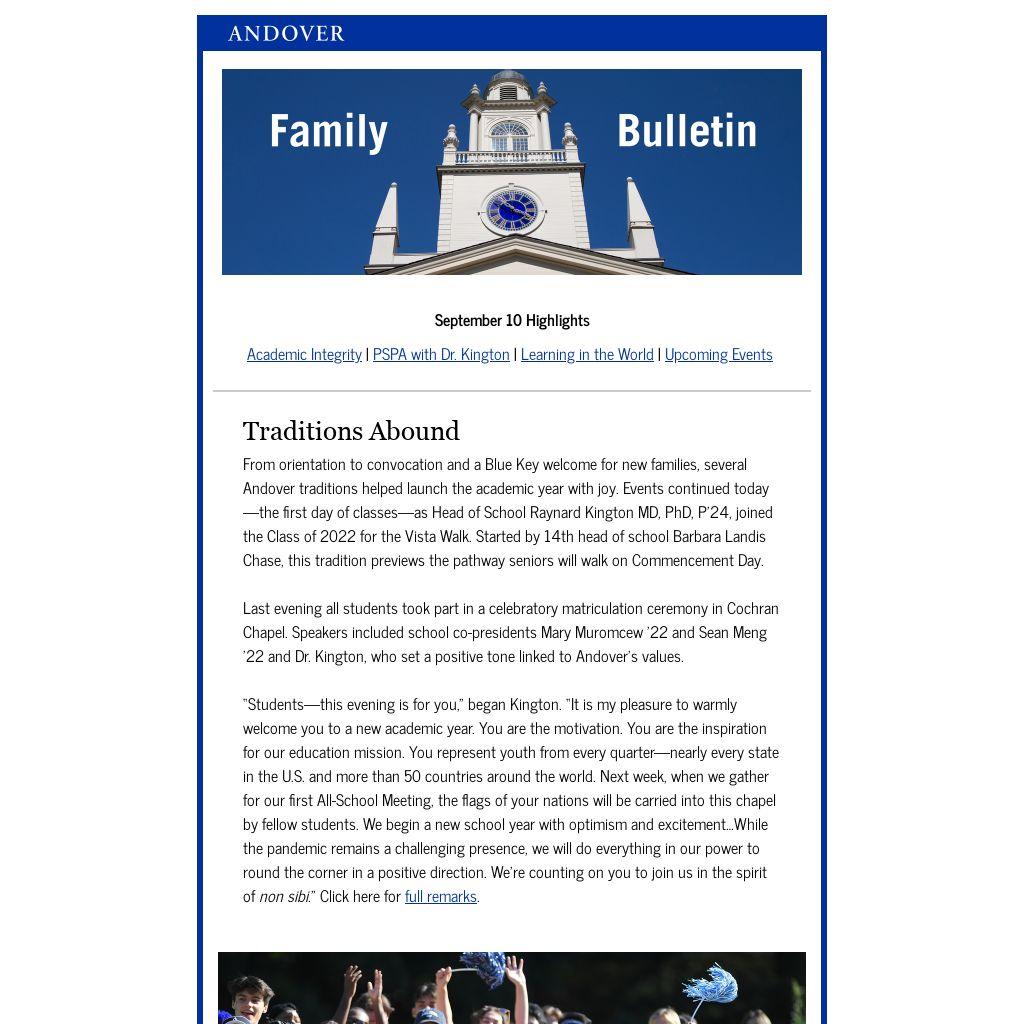 You received this message because you are a valued member of the Andover community. We are obligated to communicate with you, and require you to be on our email list while your student(s) attends Phillips Academy. For more information contact the Dean of Studies Office. |