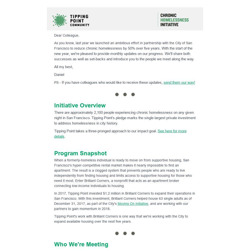 In 2017, Tipping Point invested $1.2 million in Brilliant Corners to expand their operations in San Francisco. With this investment, Brilliant Corners helped house 63 single adults as of December 31, 2017, as part of the City's