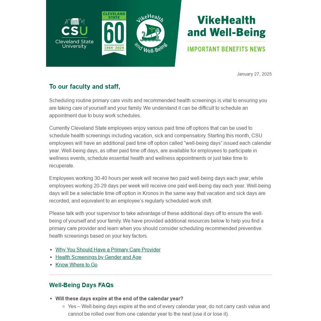 Currently Cleveland State employees enjoy various paid time off options that can be used to schedule health screenings including vacation, sick and compensatory. Starting this month, CSU employees will have an additional paid time off option called “well-being days” issued each calendar year. Well-being days, as other paid time off days, are available for employees to participate in wellness events, schedule essential health and wellness appointments or just take time to recuperate.