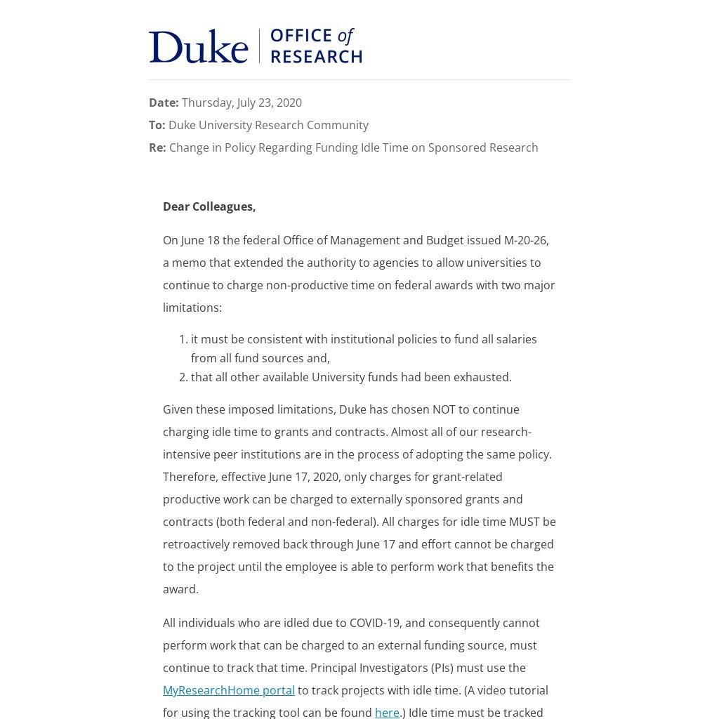 Given these imposed limitations, Duke has chosen NOT to continue charging idle time to grants and contracts. Almost all of our research-intensive peer institutions are in the process of adopting the same policy. Therefore, effective June 17, 2020, only charges for grant-related productive work can be charged to externally sponsored grants and contracts (both federal and non-federal). All charges for idle time MUST be retroactively removed back through June 17 and effort cannot be charged to the project until the employee is able to perform work that benefits the award.