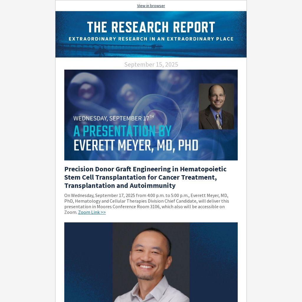 On Wednesday, September 17, 2025 from 4:00 p.m. to 5:00 p.m., Everett Meyer, MD, PhD, Hematology and Cellular Therapies Division Chief Candidate, will deliver this presentation in Moores Conference Room 3106, which also will be accessible on Zoom. Zoom Link >>