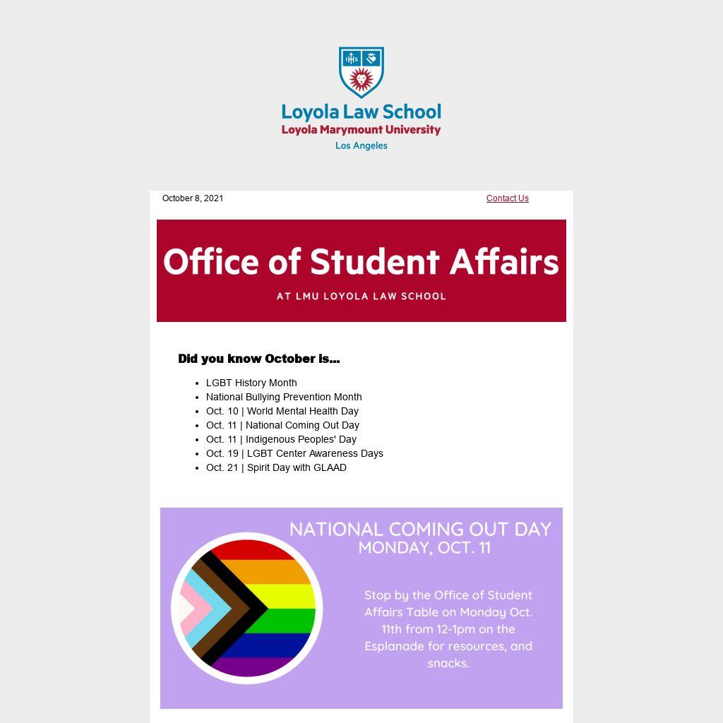 Stop by OutLaw's table on Oct. 20th on the Esplanade for some goodies, resources and to meet the some of the OutLaw members. OutLaw was founded in 1972 and is proud to be the first organization of its kind to be recognized by a law school in United States. OutLaw strives to provide Loyola students with current information regarding legal and political issues faving the LGBTQ community. OutLaw recently partnered with the Long Beach LGBT Center to bring a Legal Name & Gender Marker Change Clinic here at Loyola as a way to provide queer-focused pro bono work for students. Contact OutLaw for more information.