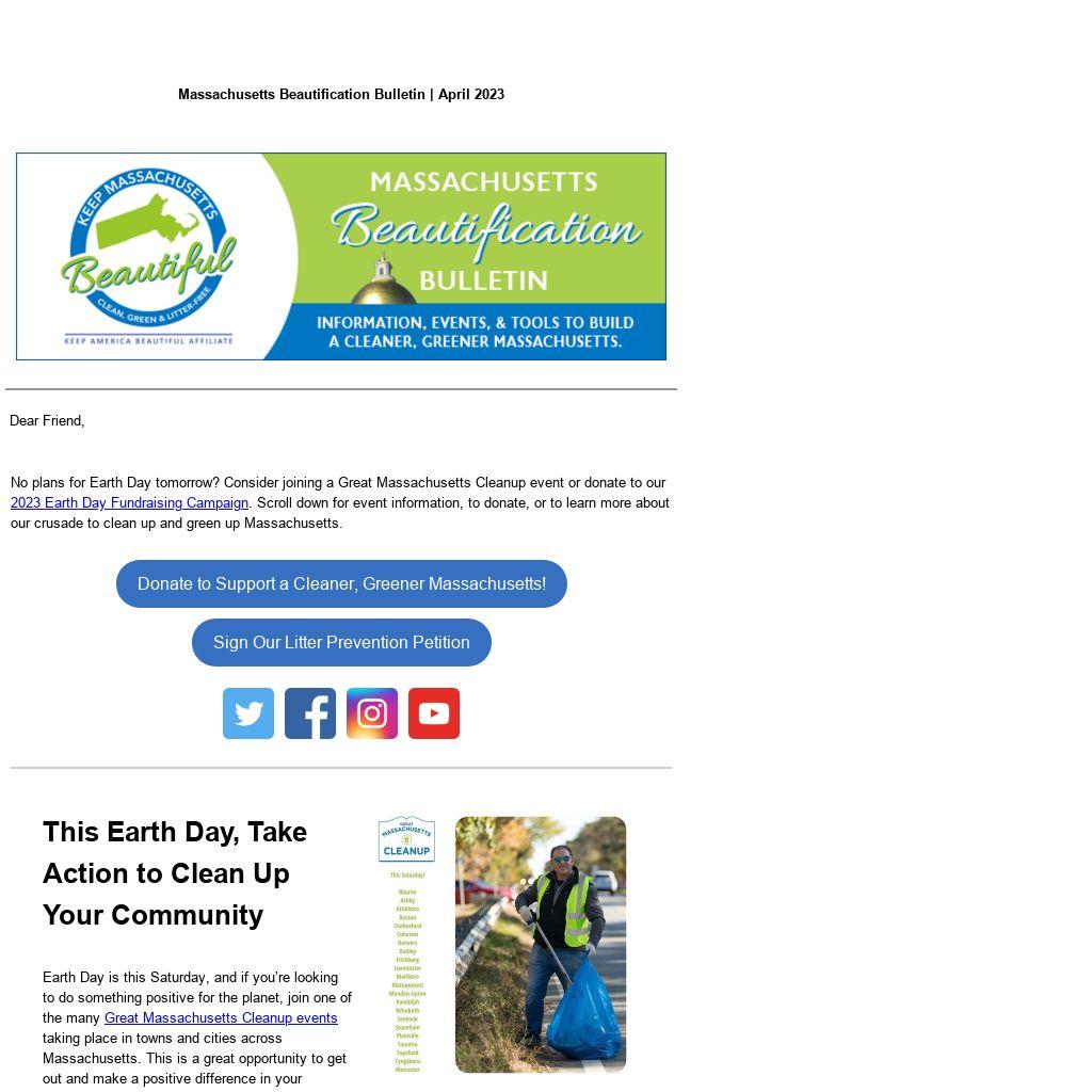 No plans for Earth Day tomorrow? Consider joining a Great Massachusetts Cleanup event or donate to our 2023 Earth Day Fundraising Campaign. Scroll down for event information, to donate, or to learn more about our crusade to clean up and green up Massachusetts.