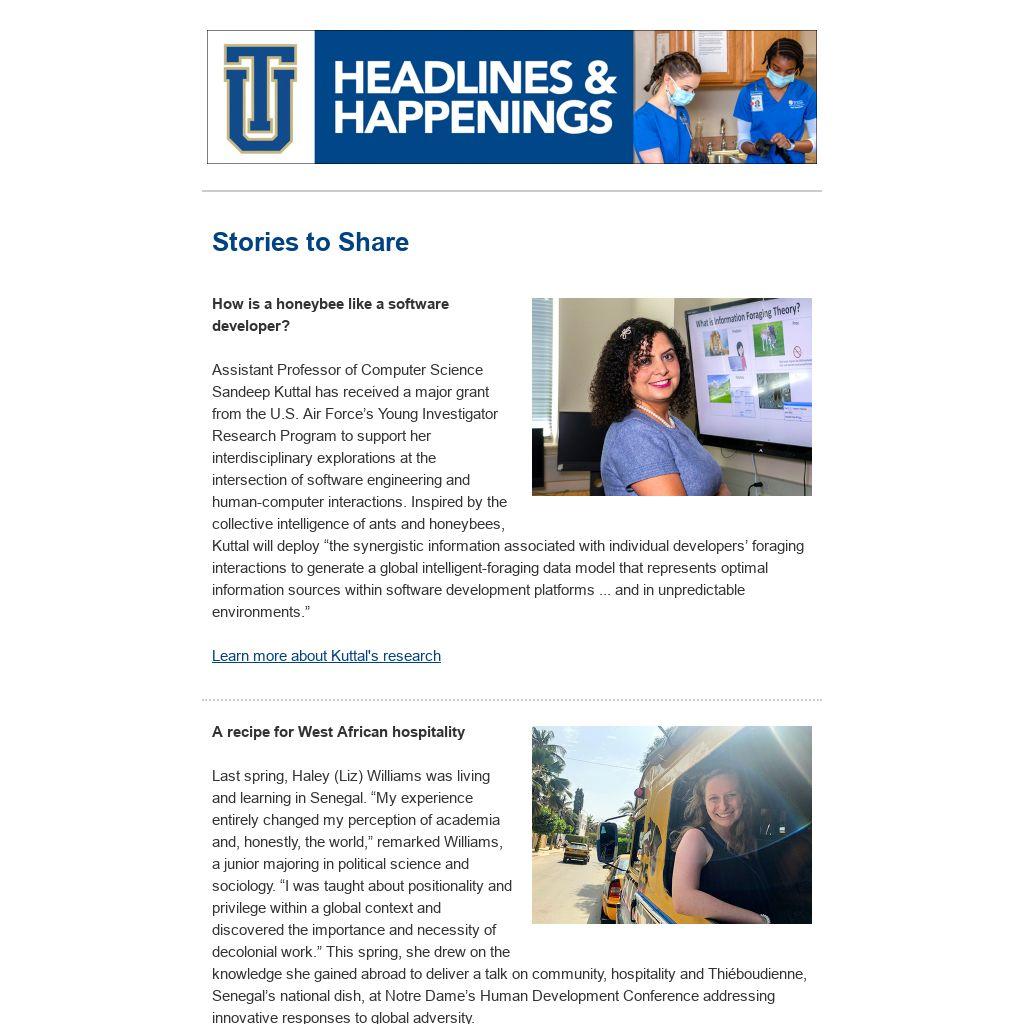 Last spring, Haley (Liz) Williams was living and learning in Senegal. “My experience entirely changed my perception of academia and, honestly, the world,” remarked Williams, a junior majoring in political science and sociology. “I was taught about positionality and privilege within a global context and discovered the importance and necessity of decolonial work.” This spring, she drew on the knowledge she gained abroad to deliver a talk on community, hospitality and Thiéboudienne, Senegal’s national dish, at Notre Dame’s Human Development Conference addressing innovative responses to global adversity.