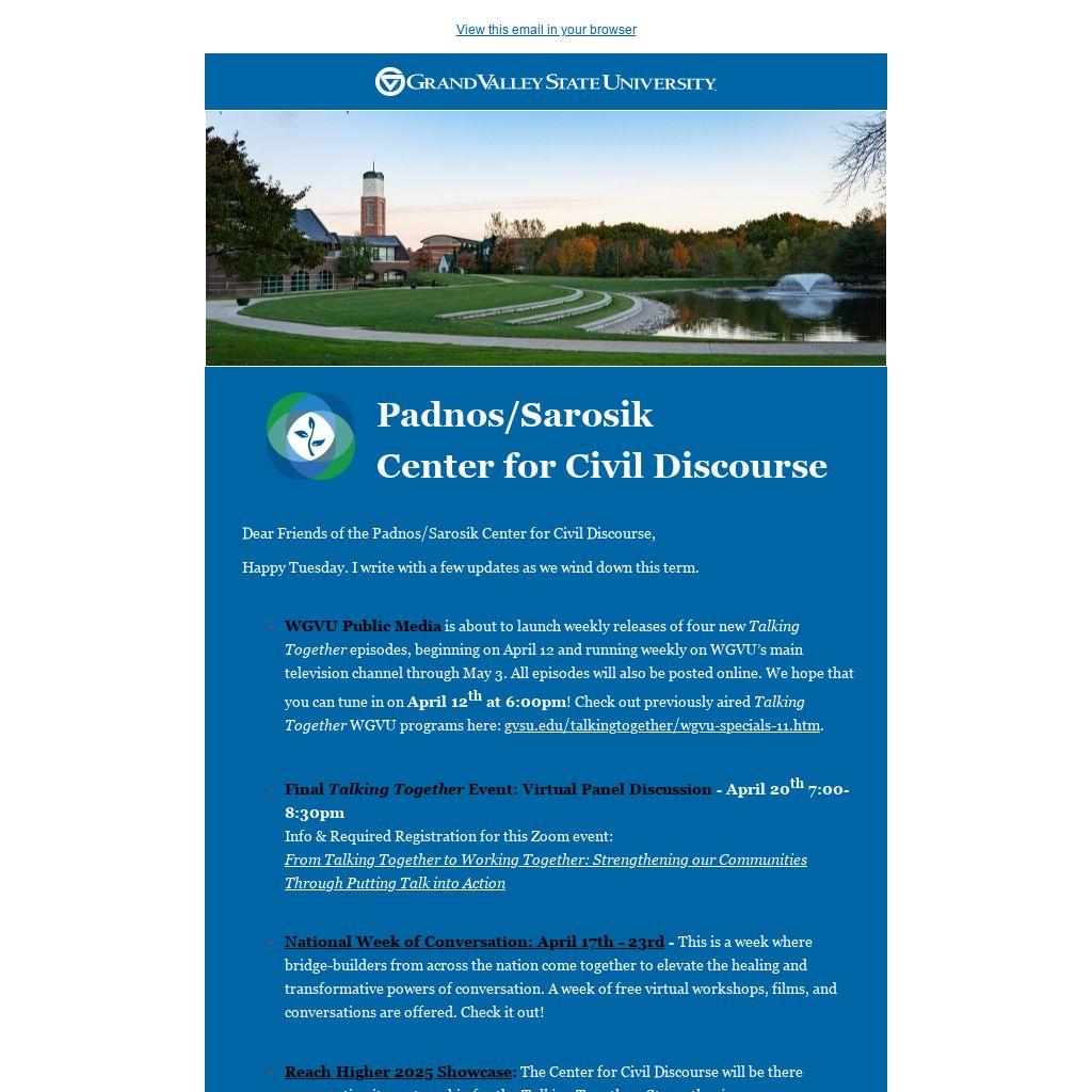 - Reach Higher 2025 Showcase: The Center for Civil Discourse will be there representing its partnership for the Talking Together: Strengthening our Communities Through Conversation initiative. Please stop by on April 21st at 11:30am-2:30pm in the DeVos Plaza (Downtown Pew Campus).