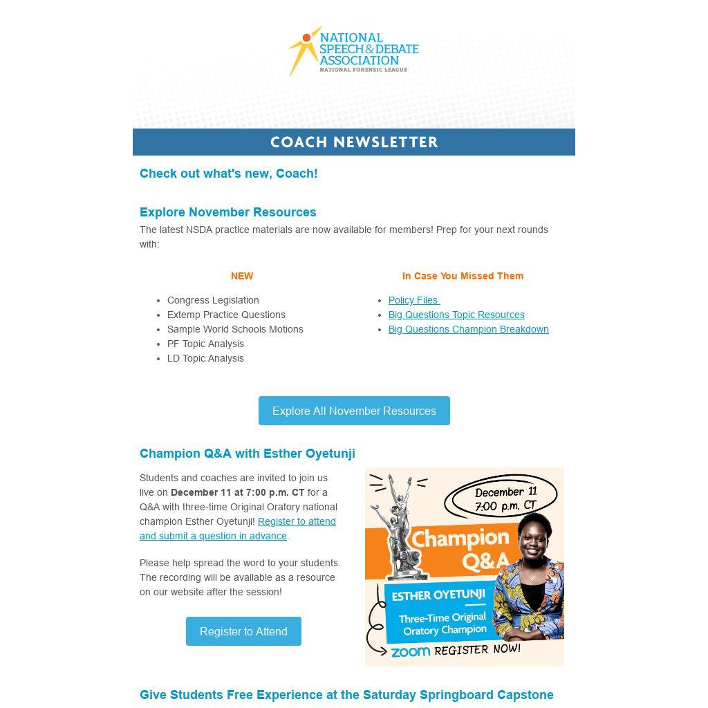 Students and coaches are invited to join us live on December 11 at 7:00 p.m. CT for a Q&A with three-time Original Oratory national champion Esther Oyetunji! Register to attend and submit a question in advance.