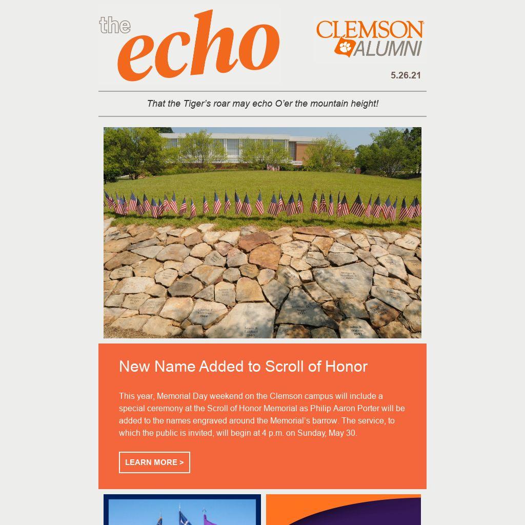 The Clemson Alumni Association will be sharing regular updates with the Clemson Family via email. Update your contact information to make sure you are receiving these updates.