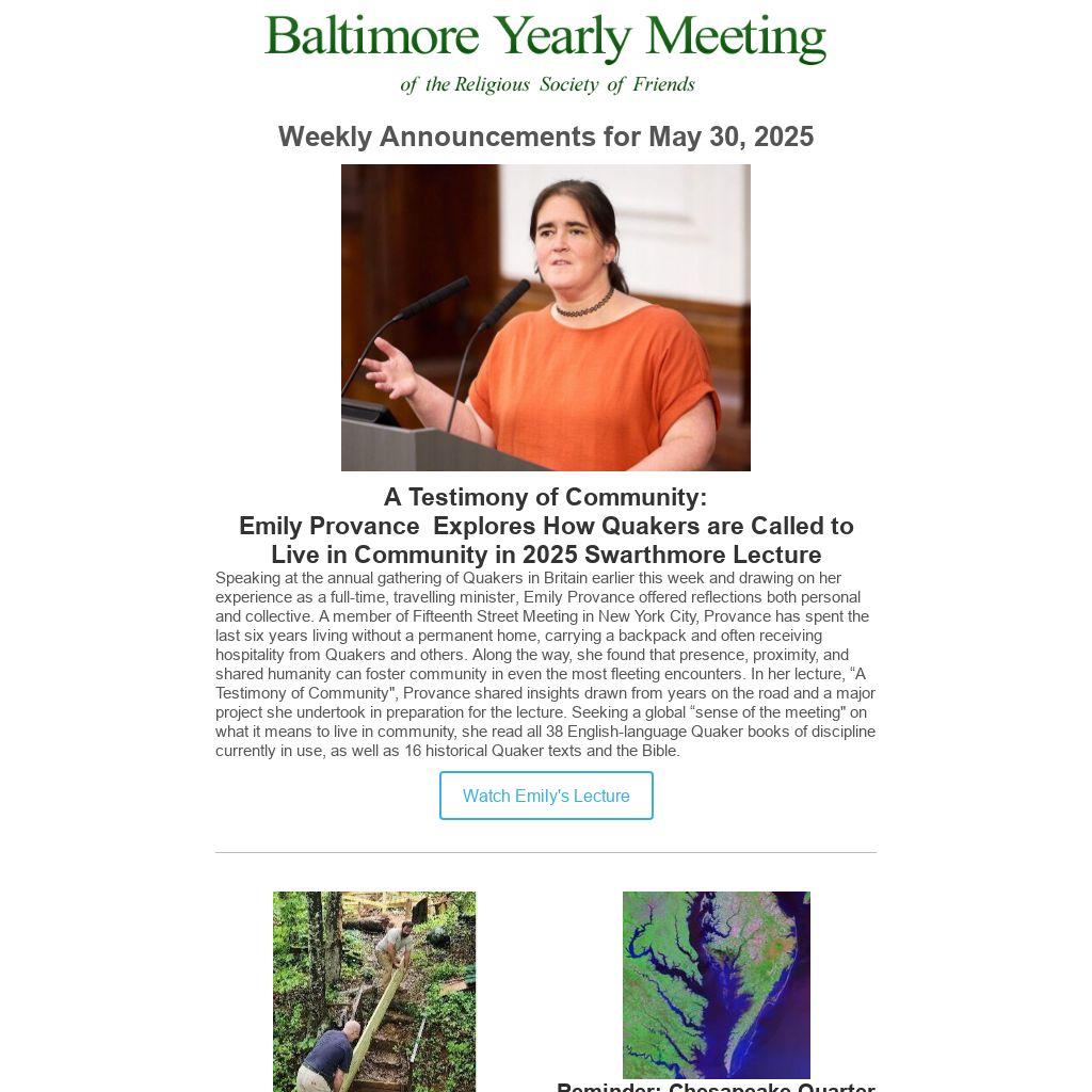 Chesapeake Quarter will meet on Sunday, June 8th at Annapolis Meeting and online via Zoom. The time together will begin at 9:30am and the afternoon will include Meeting for Sharing on what's going on in our Meetings begins at 9:30am, followed by Meeting for Worship at 11am, lunch, and we an after-lunch visit with Brian Blackmore, the Director of Quaker Engagement of the American Friends Service Committee. Chesapeake Quarter includes Annapolis, Gunpowder, Homewood, Little Falls, Patapsco, Patuxent, Sandy Spring, and Stony Run.