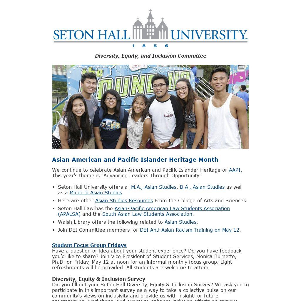 Did you fill out your Seton Hall Diversity, Equity & Inclusion Survey? We ask you to participate in this important survey as a way to take a collective pulse on our community’s views on inclusivity and provide us with insight for future programming, workshops, and events to enhance inclusion efforts on campus. The survey is voluntary, and the results are confidential. The survey is expected to take approximately 7-10 minutes. Thank you in advance for your feedback!