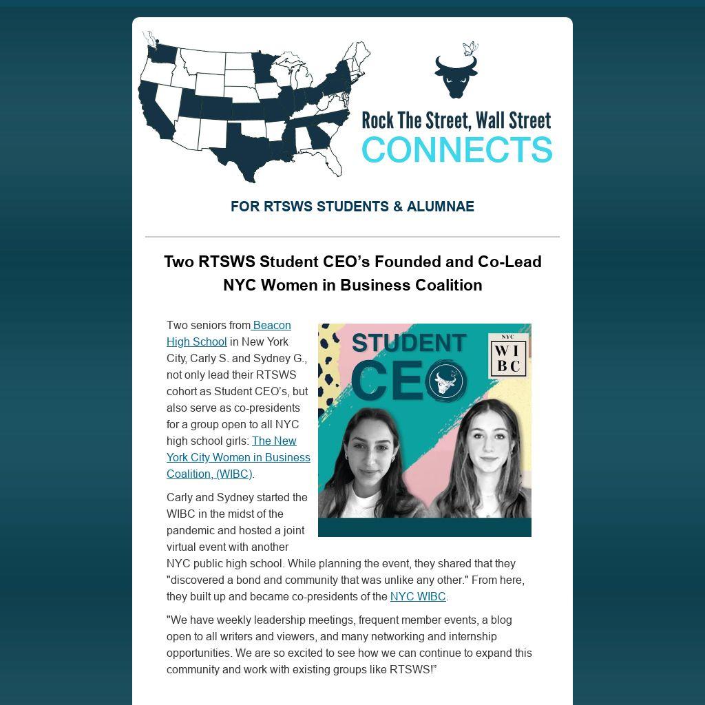 Their leadership within both groups strengthens the larger mission. Carly and Sydney said, "both RTSWS and NYC WIBC are founded on opening up the business world to a larger community, specifically women. Our WIBC seeks to empower young girls in business, and we do so through speaker events, member-based networking, a blog, a website platform with slide lessons on diverse business topics, and having regular meetings among members for support and a sense of community with like-minded women. That is why getting involved in RTSWS was so appealing to us, as you guys are similarly seeking to provoke the business mind in highschool girls, who are often guided away from finance and business."
