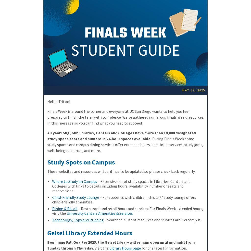 Finals Week is around the corner and everyone at UC San Diego wants to help you feel prepared to finish the term with confidence. We’ve gathered numerous Finals Week resources in this message so you can find what you need to succeed.